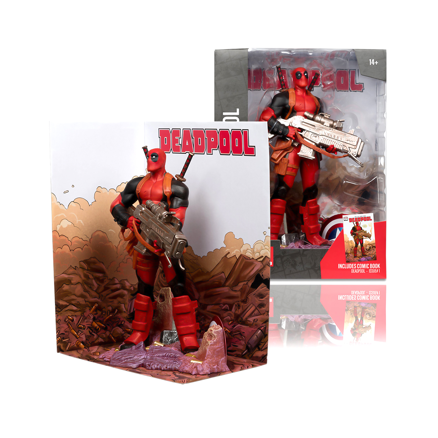 Inspirado en el número 1 del comic ‘Deadpool’. Estatua de PVC de 27 cm con base ambiental y escena de fondo. Tarjeta de arte incluida con ilustraciones de personajes en la parte delantera y sinopsis cómica.