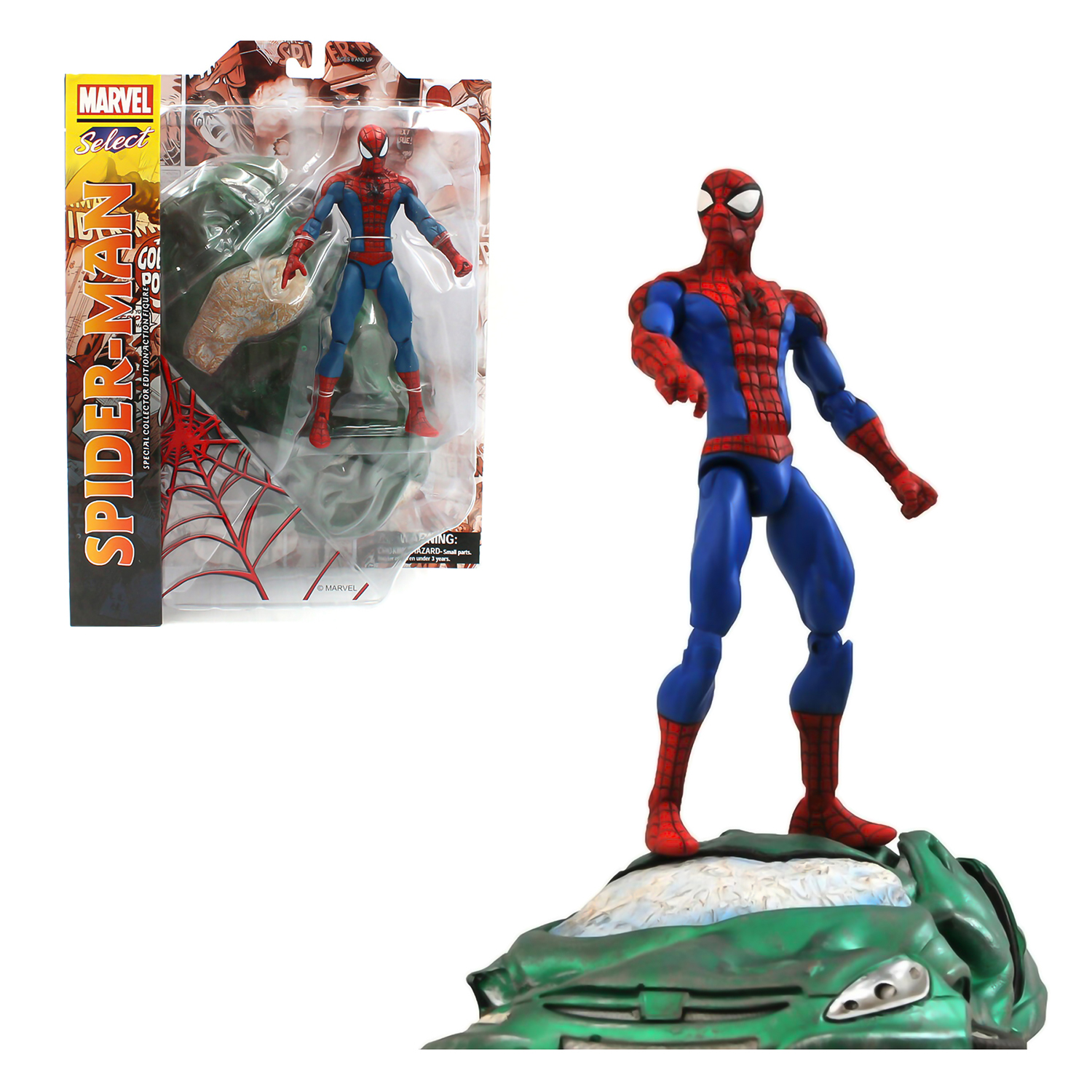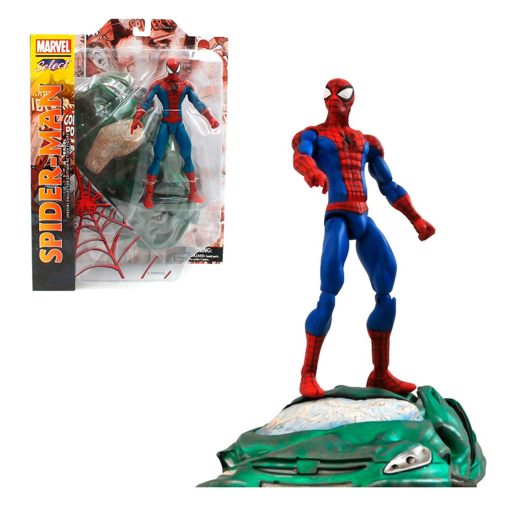 Diamond Select Toys, dentro de la colección Marvel Select, incluye esta figura de Spider-Man . Con 16 puntos de articulación, viene acompañada de una base que simula un coche aplastado. Tamaño aprox. 18 cm.
