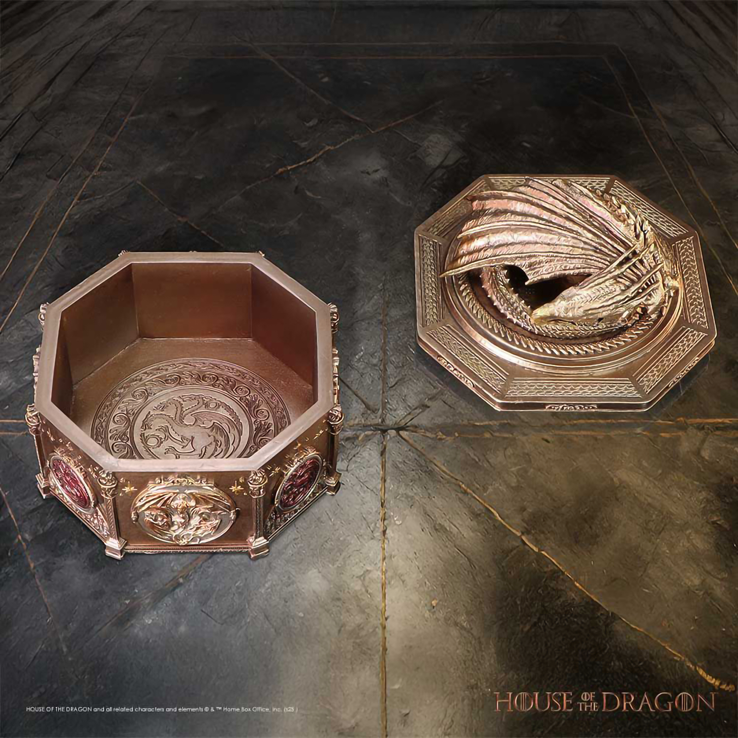 Caja de almacenamiento con licencia oficial inspirada en Syrax, el dragón de la princesa Rhaenyra Targaryen de ‘La Casa del Dragón’. La caja cuenta con una detallada figura de Syrax enroscada en la parte superior de la tapa extraíble con pintura metálica y símbolos reconocibles alrededor de la caja. Fabricada en resina y pintada a mano. Tamaño aprox. 15 cm.