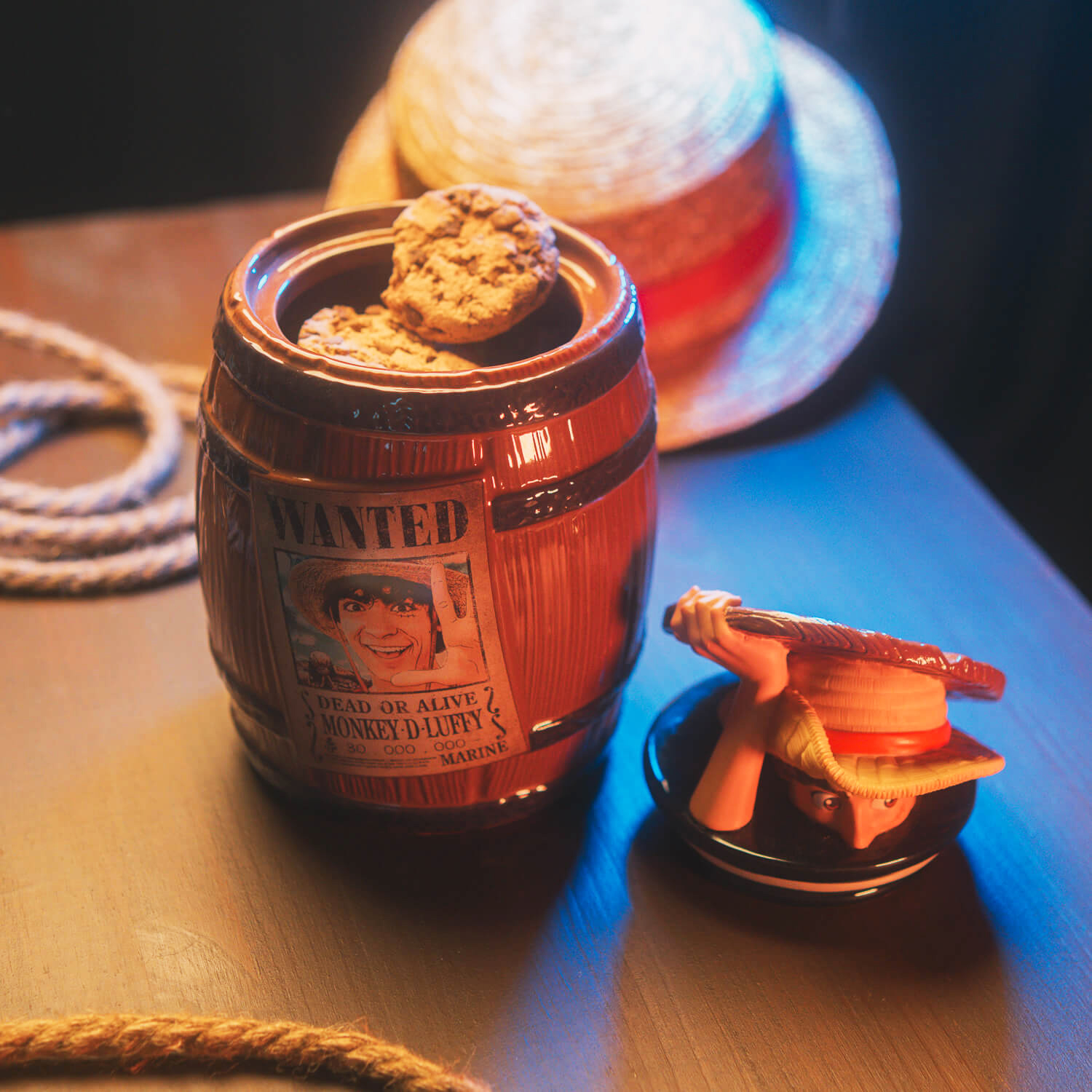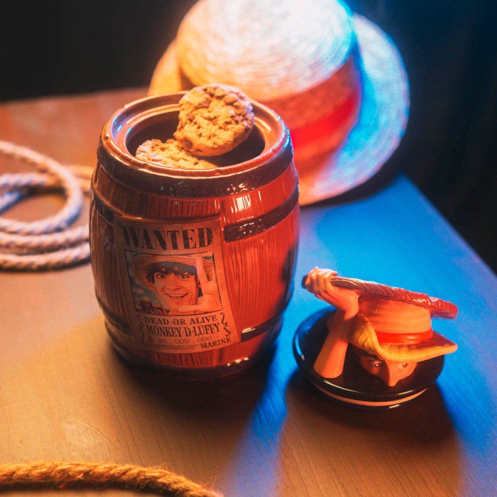 Este galletero de One Piece está basado en la serie Live Action de Netflix y muestra a Luffy escondido en un barril con su propio cartel de ‘Se busca’ pegado sobre el mismo. Es un recipiente ideal para almacenar snacks y otros alimentos.