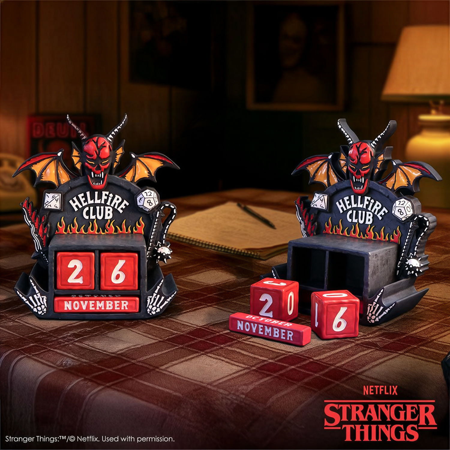 - Con bloques de madera roja intercambiables durante días y meses, todo alojado en un marco resistente con llamativos gráficos de Hellfire Club