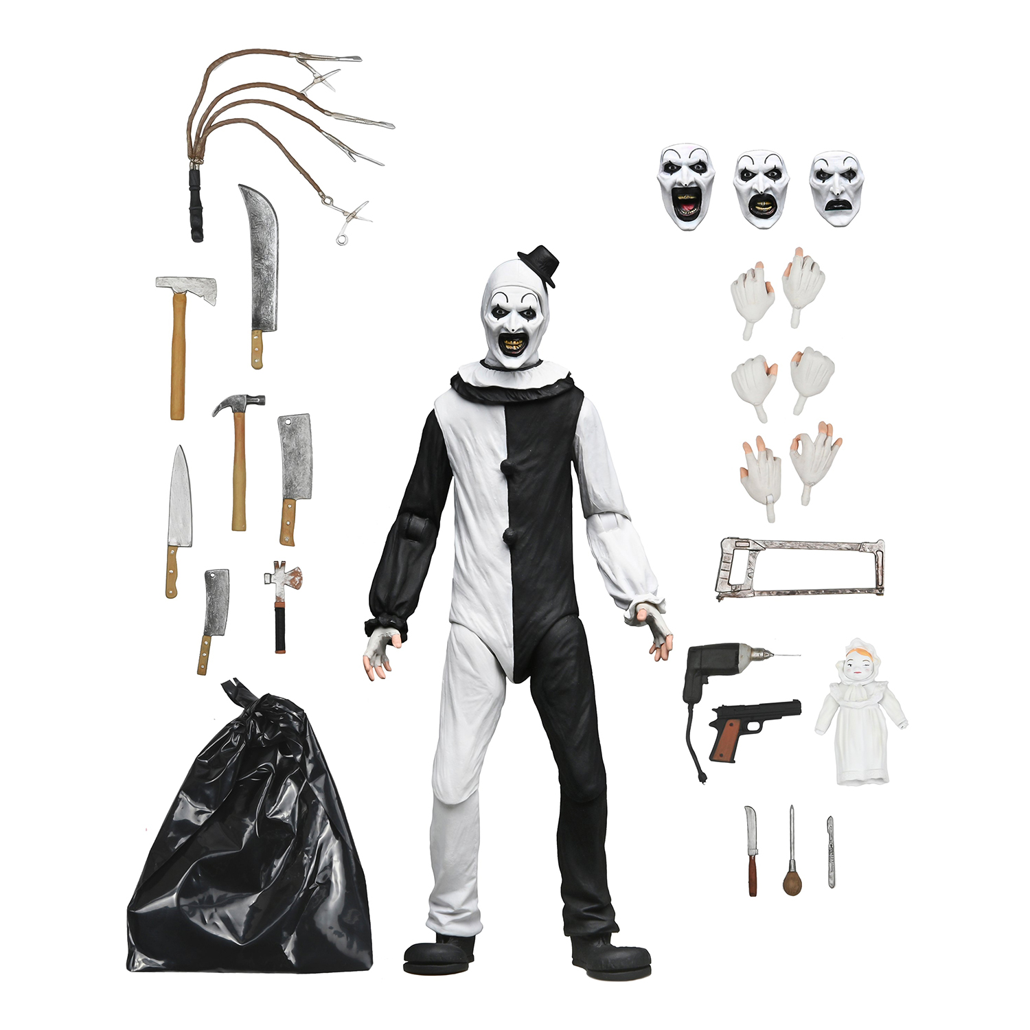 - Capturando cada detalle inquietante del asesino silencioso, esta figura de acción, totalmente articulada, incluye caras intercambiables, manos y un inquietante arsenal de armas y accesorios