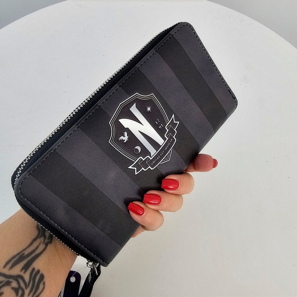 Añade un toque de misterio y estilo a tus elementos esenciales del día a día con esta cartera ‘Essencial Varsity’ (negra) inspirada en el icónico y enigmático personaje Miércoles Addams. Esta cartera le da un toque moderno al clásico estilo universitario.