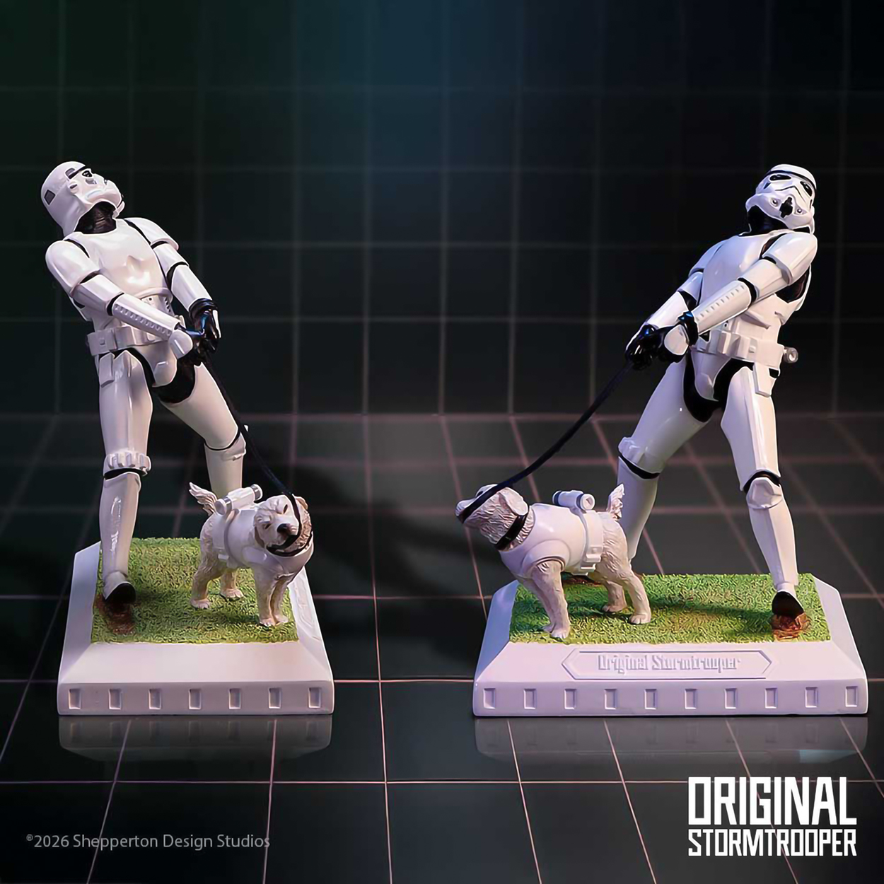 Una figura humorística e imaginativa que captura un momento cómico entre un Stormtrooper y su desafiante compañero de cuatro patas. En un giro encantador, el perro con armadura sostiene la correa en su boca mientras el soldado se esfuerza por recuperar el control.