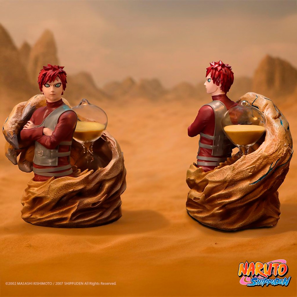 - Figura de resina altamente detallada de Gaara, con los brazos cruzados en una pose estoica, de pie sobre una base de arena arremolinada que se transforma en una monstruosa mano con garras