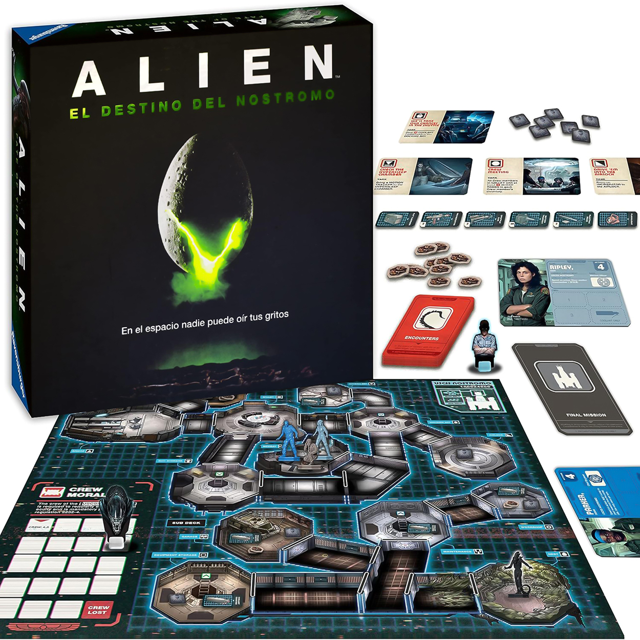 1 tablero del Nostromo , 5 paneles de tripulantes , 5 miniaturas de tripulante y 1 miniatura de alien , 1 marcador de moral con pedestal , 46 cartas, 55 fichas, 1 contador de autodestrucción y1 figura de Ash con pedestal.