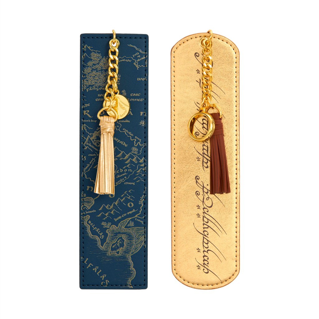- Marcapáginas con escritura élfica, hecho con polipiel dorada, con una impresión de la escritura del Anillo Único, una borla marrón y un dije de metal dorado con la inscripción del Anillo Único en una cadena dorada