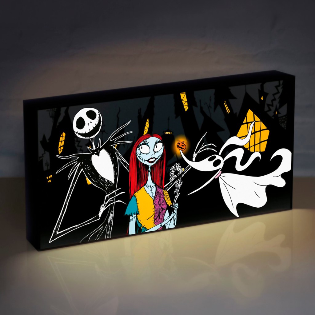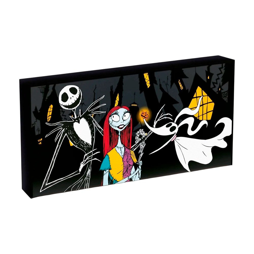 Este lienzo iluminado único de Pesadilla Antes de Navidad se verá increíble de pie en su escritorio, estante o colgado en su pared. Los LED en el interior hacen que la obra de arte original se ilumine dando un brillo ambiental y resaltando los detalles del diseño.