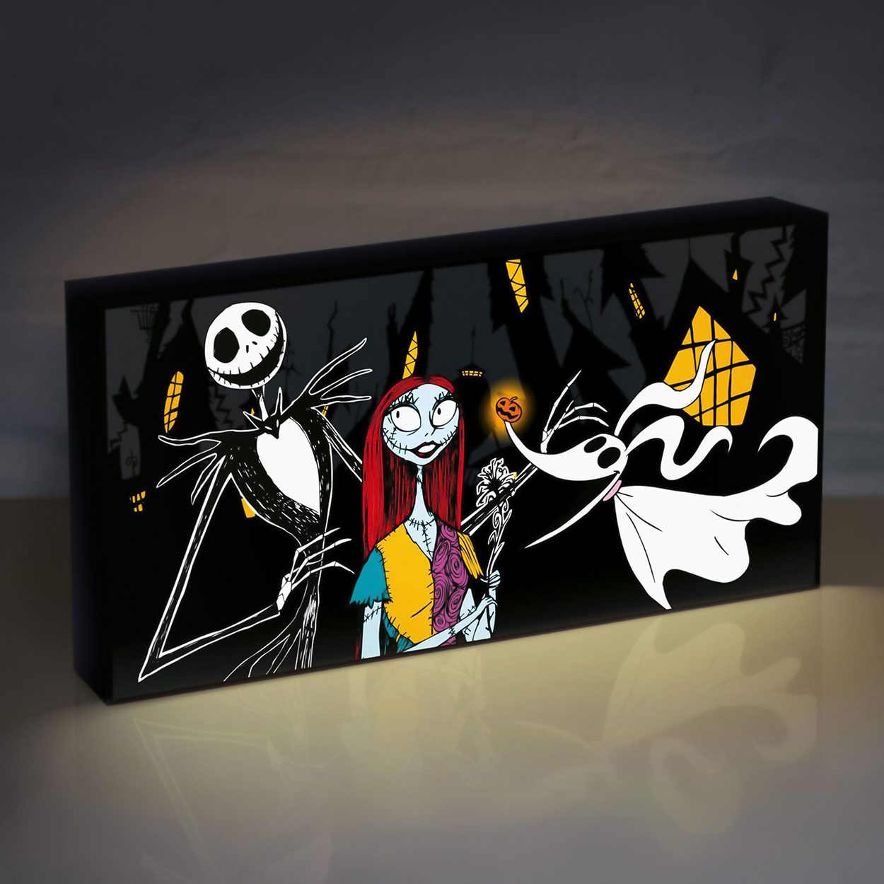 Este lienzo iluminado único de Pesadilla Antes de Navidad se verá increíble de pie en su escritorio, estante o colgado en su pared. Los LED en el interior hacen que la obra de arte original se ilumine dando un brillo ambiental y resaltando los detalles del diseño.