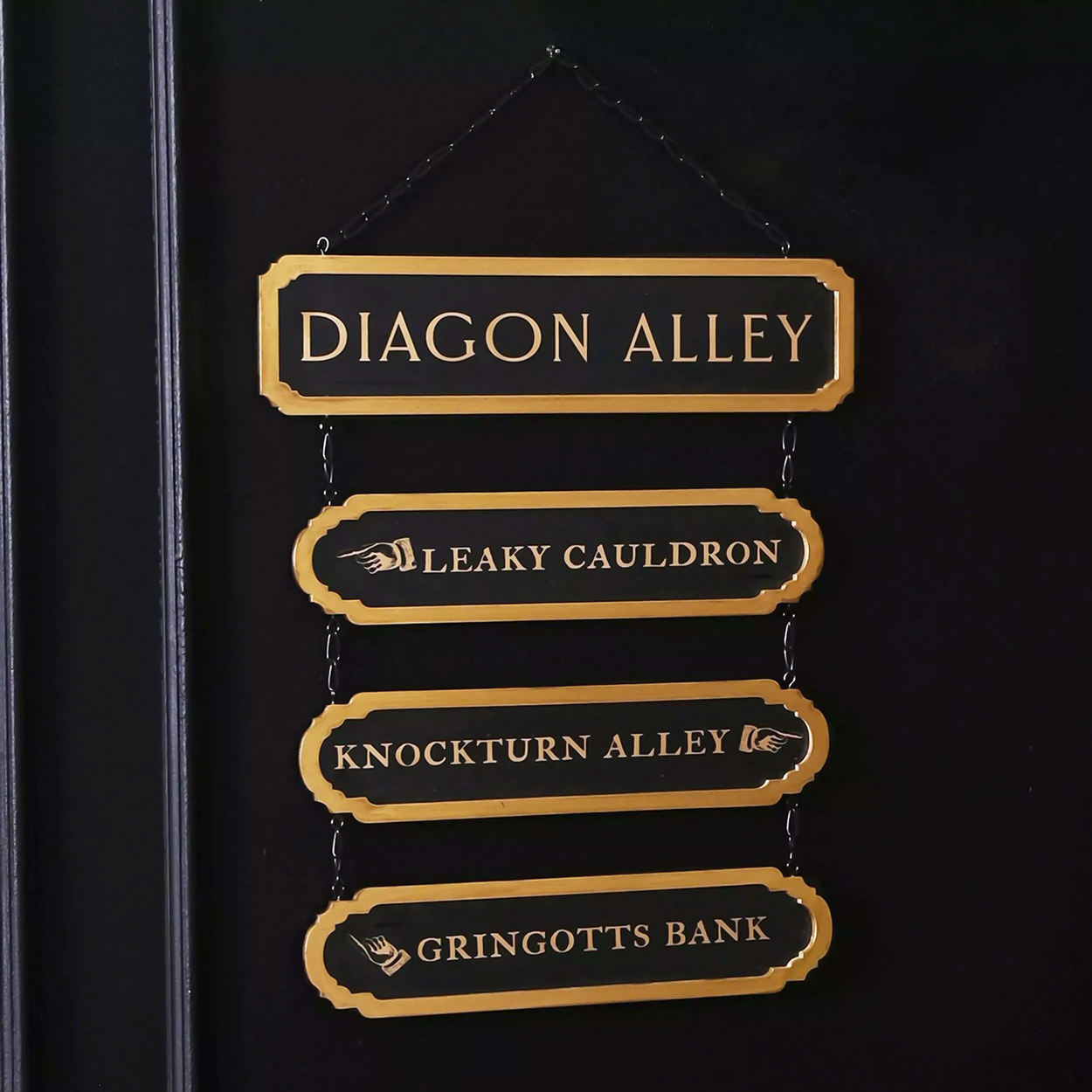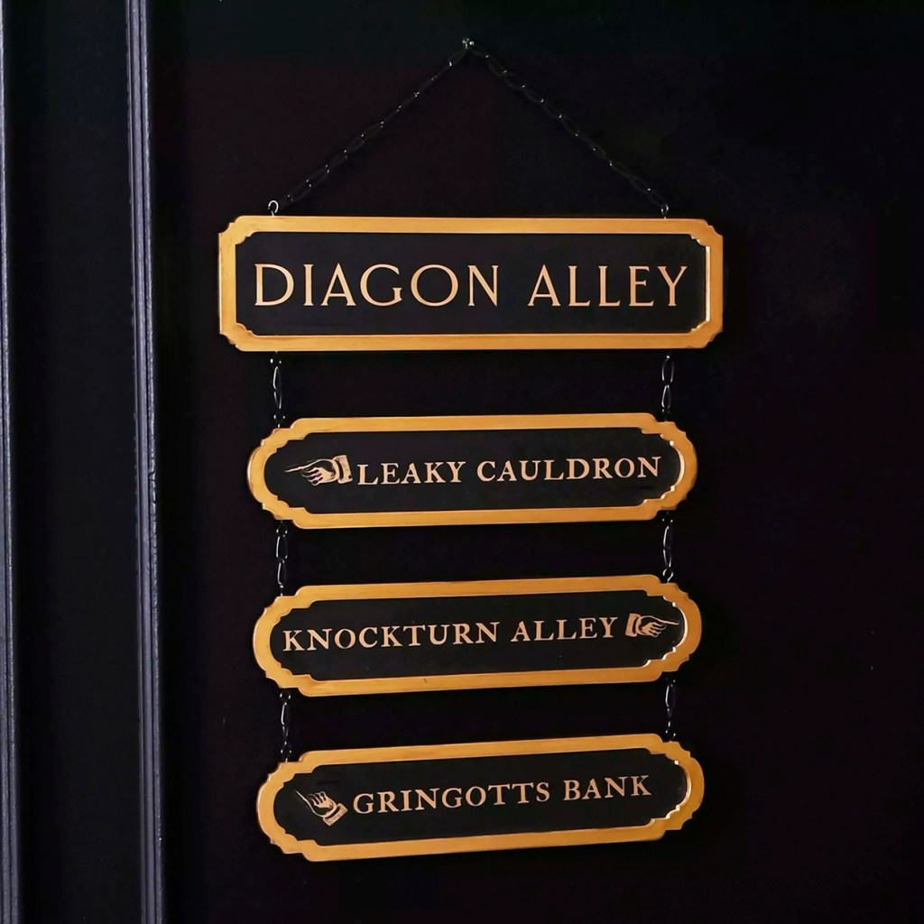 La señal metálica negra ‘Callejón Diagón’ presenta un acabado con efecto metálico, junto con otras tres señales que indican lugares conocidos: El Caldero Chorreante, el Callejón Knockturn y el Banco Gringotts