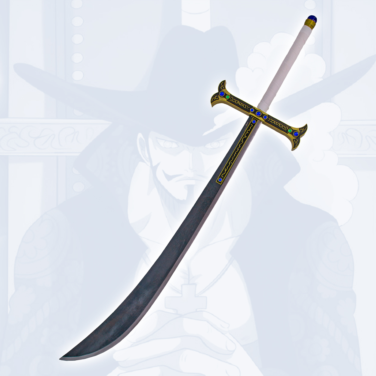- Hoja de acero en color negro y metal con decorados en dorado y perlas en azul
