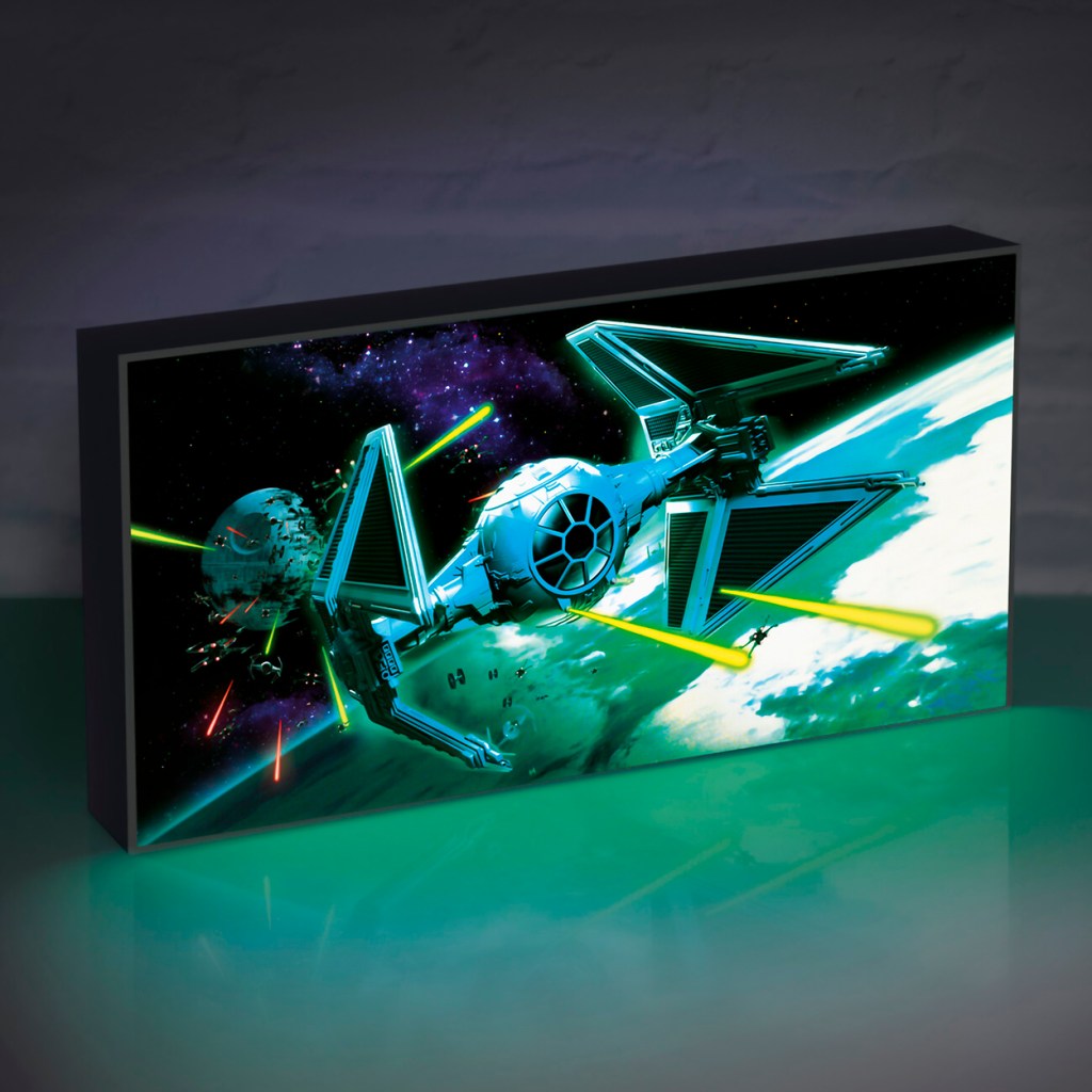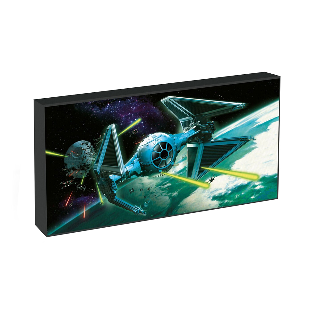 Este lienzo iluminado único de Star Wars se verá increíble de pie en su escritorio, estante o colgado en su pared. Los LED en el interior hacen que la obra de arte original se ilumine dando un brillo ambiental y resaltando los detalles del diseño.