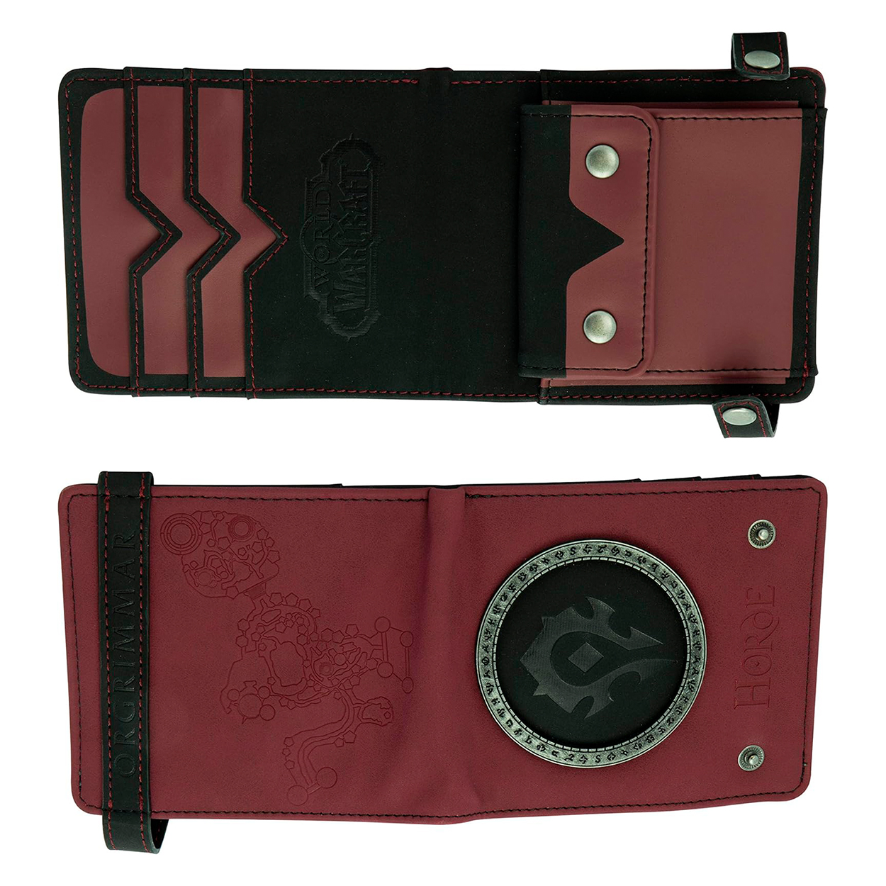 Acabado excepcional: El círculo metálico rodea el logo de la Horda en relieve, cierre con hebilla metálica, la tarjeta de Orgrimmar grabada en relieve en la parte posterior y el interior estampado con motivos de la licencia